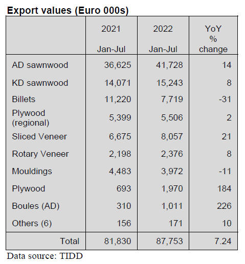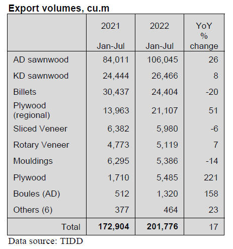 Between January and July 2022 exports of wood products