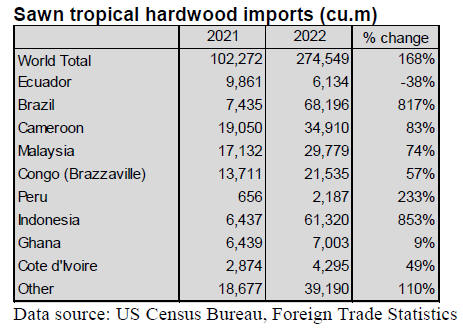 Imports of sawn tropical hardwood ended 2022 at their
