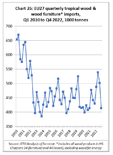 In quantity terms, total EU27 imports of tropical wood and