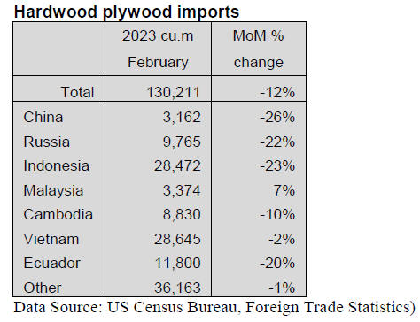 US imports of hardwood plywood continued to plummet