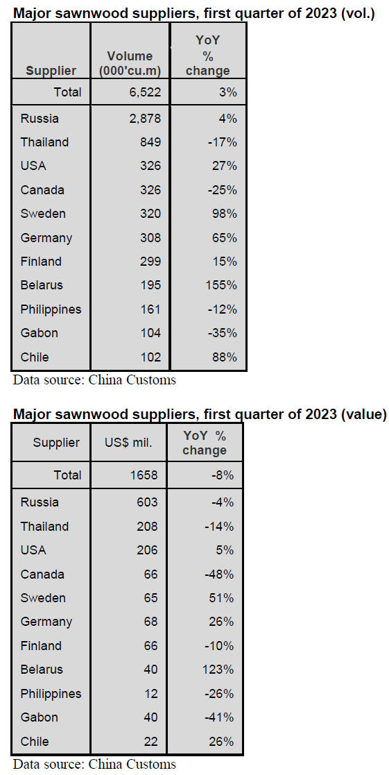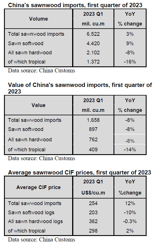 According to China Customs, sawnwood imports in the first quarter