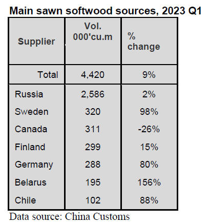 60% of China’s sawn softwood imports were from Russia in the first quarter