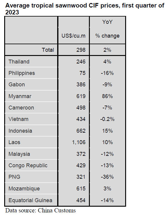 The average price of China’s tropical sawnwood imports rose 2% to