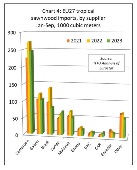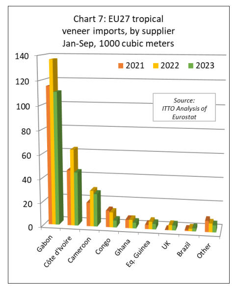 from Cameroon (-9% to 246,800 cubic metres), Gabon (-