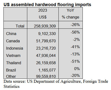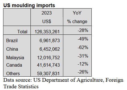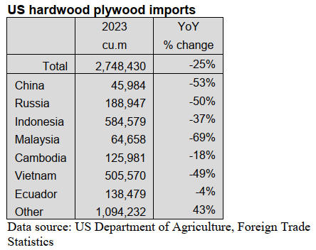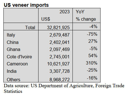 For 2023, imports of tropical hardwood veneer fell by 4%