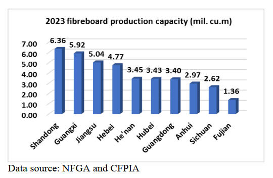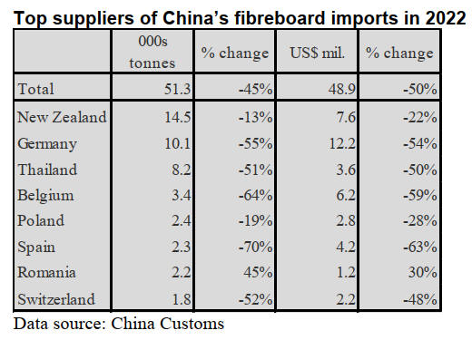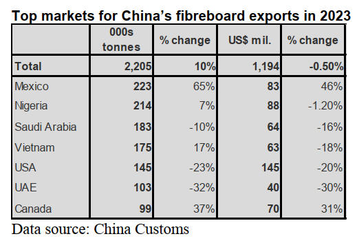 for China’s fibreboard exports in 2023, up 65% to 223,000