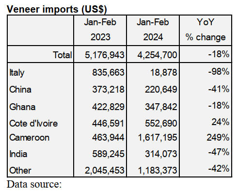 US veneer imports plummet
