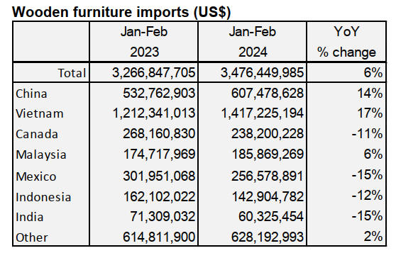 US imports of wooden furniture remained flat in February,