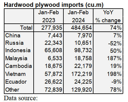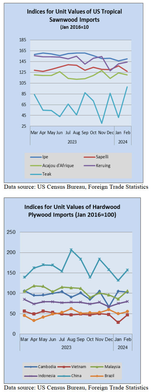 US imports of hardwood plywood fell 32% in February.