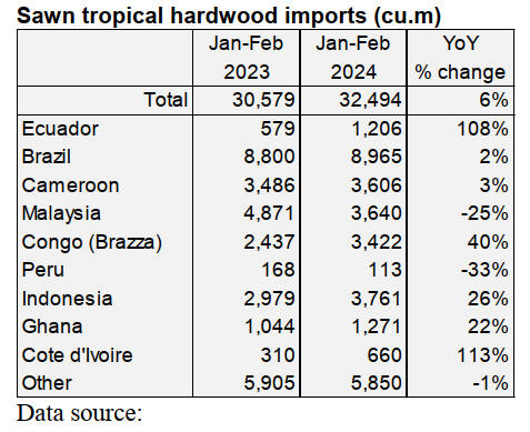 Sawn tropical hardwood imports gain 24% over last