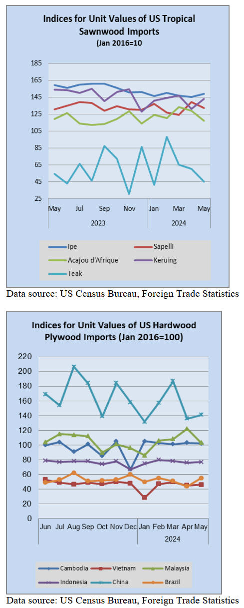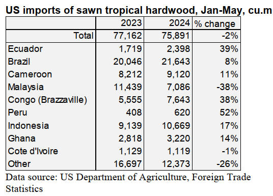 US imports of sawn tropical hardwood tumbled 15% in