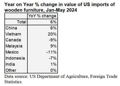 US imports of wooden furniture grew by 15% in May,