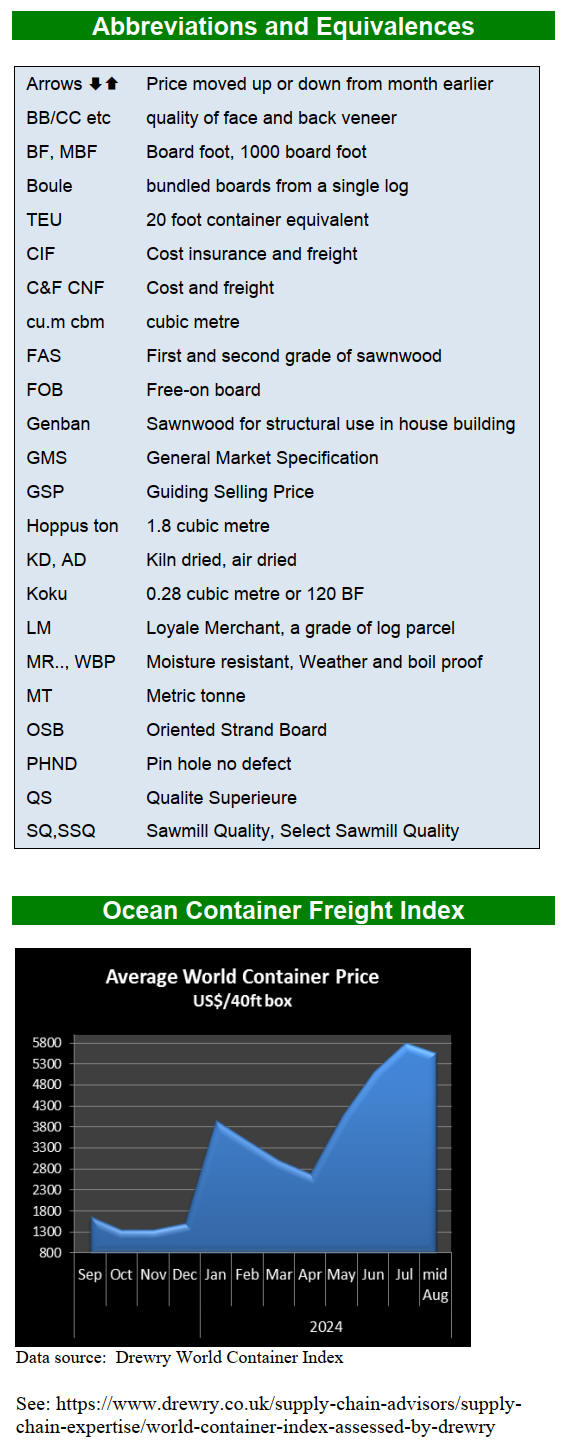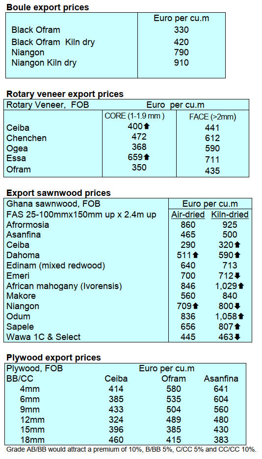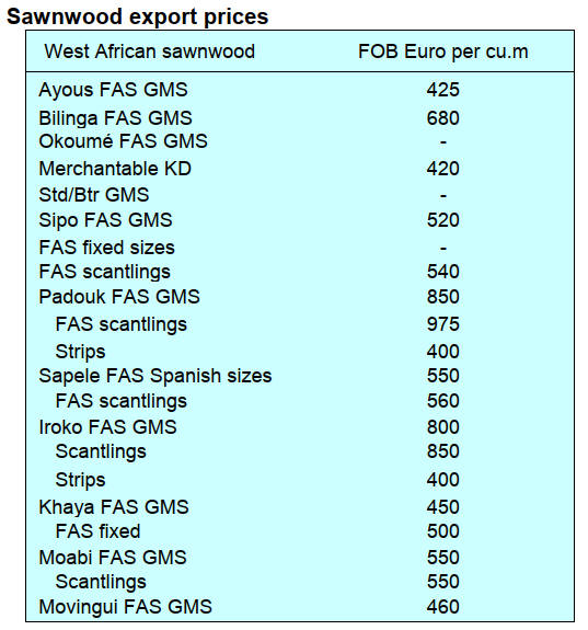 for sawn okoume KD dropping to Eur400 per cubic metre