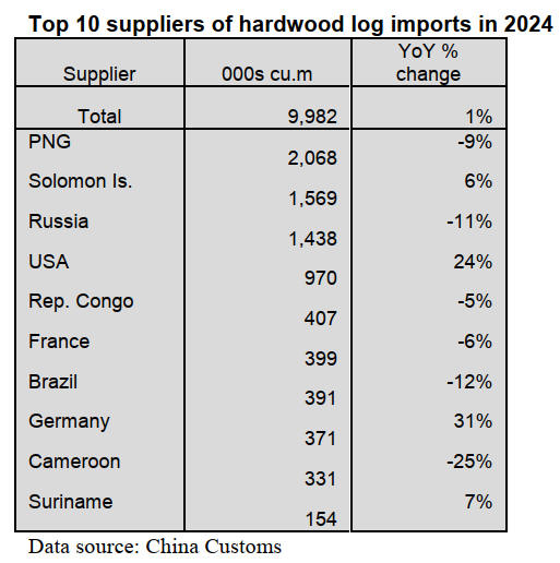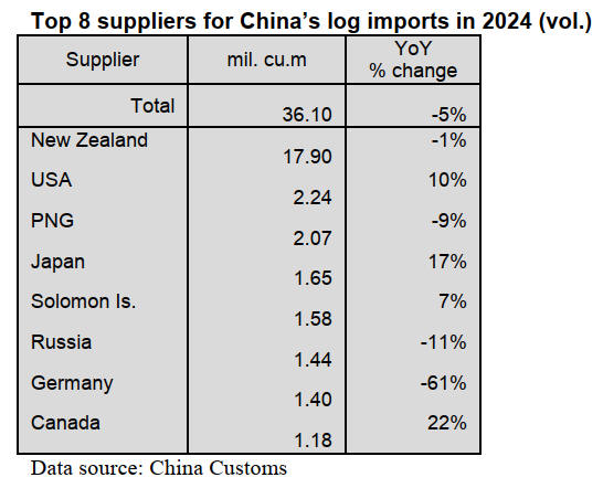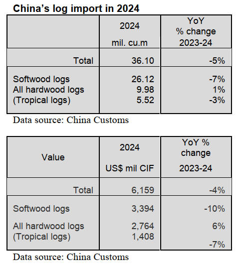According to China Customs, log imports in 2024 totalled