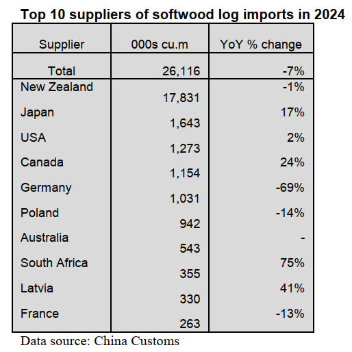 Of total 2024 log imports, softwood log imports fell 7% to