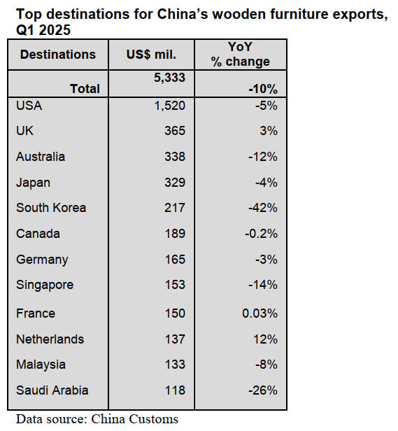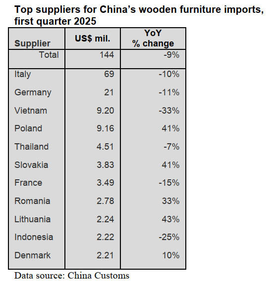 wooden furniture imports in the first quarter of 2025 fell