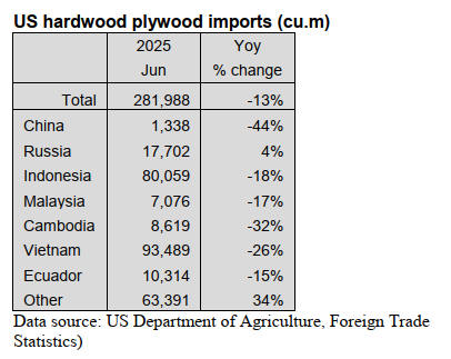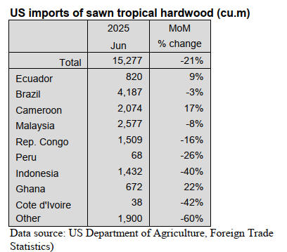 US imports of sawn tropical hardwood fell 21% in June,