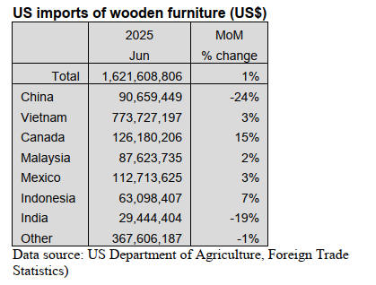 Imports of wooden furniture rose 1% in June, stabilising