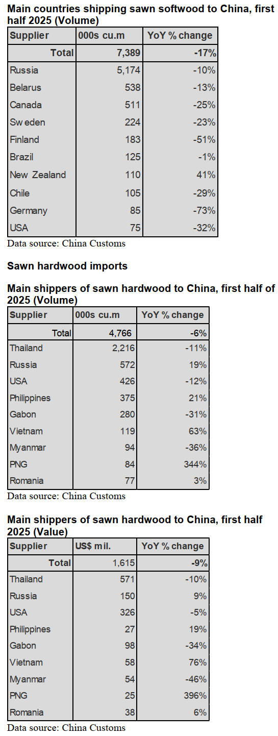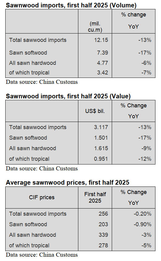 Sawn hardwood imports declined 6% to 4.77 million cubic