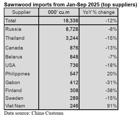 2025 China’s sawnwood imports declined 12% to 18.34