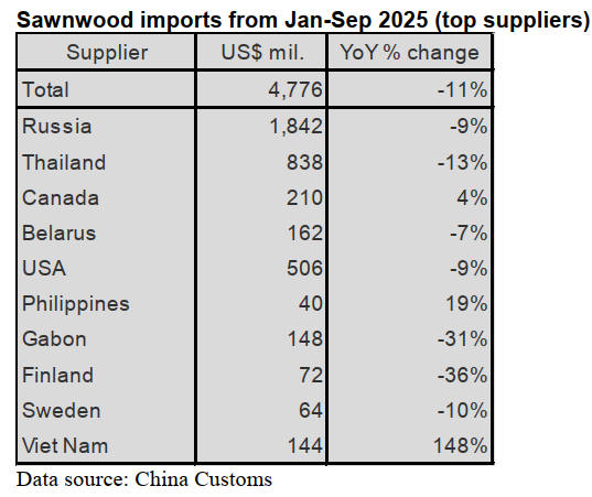 Russia was the largest supplier of China’s sawnwood