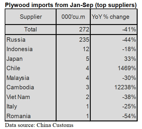 China’s plywood imports declined 41% to 272,000 cubic