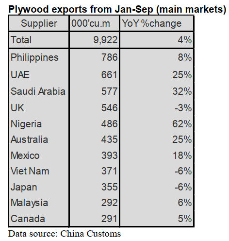 plywood exports. From January to September 2025