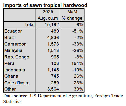 US imports of sawn tropical hardwood fell 6% in August