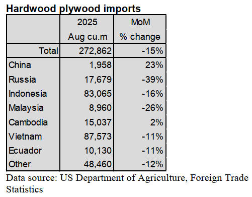 While US imports of hardwood plywood dropped by 15%