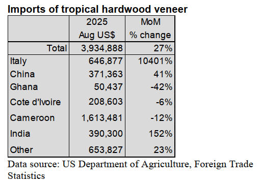 US imports of tropical hardwood veneer jumped 27% in