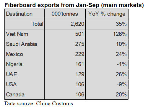 China’s fibreboard exports to Vietnam, the largest