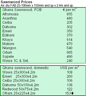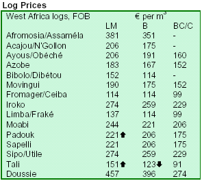 Padouk prices continued to firm, with LM grade moving up EURO.15 per m3. Tali LM grade also surged