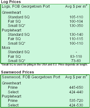 Exports of logs and sawnwood from Guyana are dominated by greenheart, purpleheart, mora and