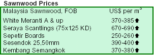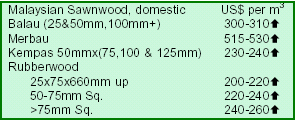 Despite the Government's imposition of a total ban on rubberwood log exports and an export quota on rubberwood sawnwood, MFEA reports that many of its members still face a shortage of rubberwood. The prolonged rainy season is worsening the situation. MFAE says that the price of rubberwood has increased by 50 ringgit per ton/week in the last months. Prices of rubberwood now stand well above 1,500 ringgit per ton. The last time such a high raw