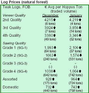 The table below shows FOB average prices Yangon for various grades of teak logs sold by the Myanmar Timber Enterprise (MTE) at their sealed tender held on 20 January and tender held on 23 January 2006.