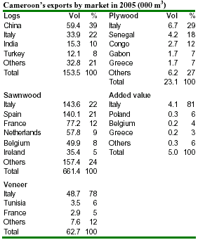 Cameroon's log exports were stable at 153,468 m3 in 2005. China overtook Italy as Cameroon¡¯s main log export destination that year with India also rapidly gaining ground. Sawnwood was