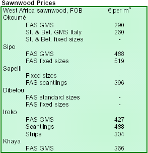 EURO.15 to EURO.182 per m3 , while B grade remained at EURO.168 per m3. Prices for okan also held onto recent gains and seem set to continue upwards due to strong demand from Asia and Europe. Ayous prices are being affected by the dull Italian market. However, ayous production is being restricted to match the lower demand. Rains have ended in Cameroon and CAR, but still persist in Northern Republic of Congo and overall supply in the region remains moderate.