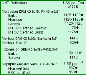 The Dutch market for tropical hardwoods remained largely inactive in the second half of January. The production of sawn timber in Malaysia, in turn,continued also in the low side due to low log inventory at sawmills. Besides various logging restrictions imposed by authorities, the influence of the wet monsoon was felt in particular. The monsoon is reported as the worst in the past 25 years. The short-supply of material had lead to