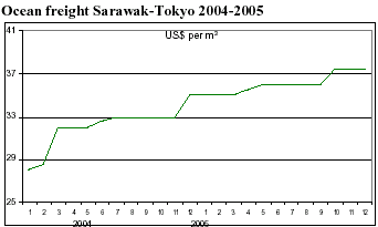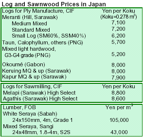 Log importers asked ¥7,500 per koku CIF (1 koku=0.278 m3) for Sarawak meranti regular logs arrived in December, while plywood mills offers were at about ¥7,200. Plywood mills continued to resist further log price increases, while importers are reported to be