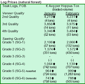The average FOB Yangon prices at the February sealed tender were (EURO per hoppus ton): EURO413 for export grade