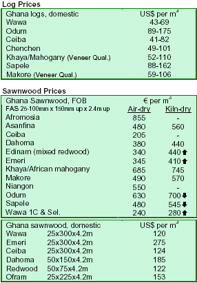 Ghana¡¯s Forestry Commission (FC) Pricing Committee left largely unaffected the Minimum Guiding Selling Prices (GSP) in the first quarter of 2006 as the variability of market prices was similar to that of the last quarter of 2005. However, there were few exceptions. Prices for niangon boules rose from .460 to .490 per m3 in the quarter under review while those for KD wawa 2C&S (quality two common and select) for Europe rose from .250 to .260 per m3, with few contracts for fixed dimensions achieving .270 per m3. Prices for KD wawa