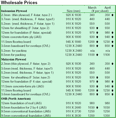 available volumes, plywood export prices continue to edge up. In Japan, prices for imported plywood, which