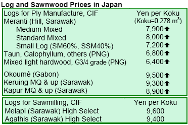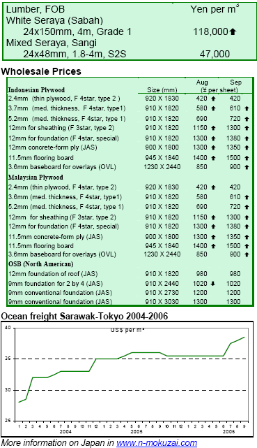 Since the price of plywood headed for Japan was increasing in Sabah, prospects for greater volumes were promising provided that the supply of logs improved. However, while supply prospects in Malaysia looked bright, the situation in Indonesia remained severe. Forest fires and a drought had deterred log production while lumber stocks remained very low. The start of the fasting month of Ramadan in late September and the approaching Monsoon rainy season were not likely to reverse the