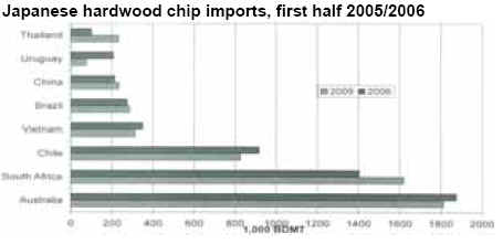 Japan’s total woodchip import volume declined 1.6% to 7 million bone-dry metric tonnes (bdmt) in the first half of 2006, compared with the same period in 2005, according to Robert Flynn, Director, International Timber RISI. Hardwood chips were unchanged at 5.73 million bdmt (82% of imports) while softwood chips fell 8.4% to 1.27 million bdmt. Average landed prices for woodchips in Japan were 3.2% higher for hardwood chips and 2% up for softwood chips.