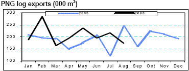 Earnings from timber exports fell to €112.6 million (288,895 m3) in Jan-Aug 2005, down 8% (down 7% in