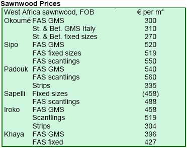 sapele prices seemed to have petered out and while most mills were offering at standard prices, there were reports