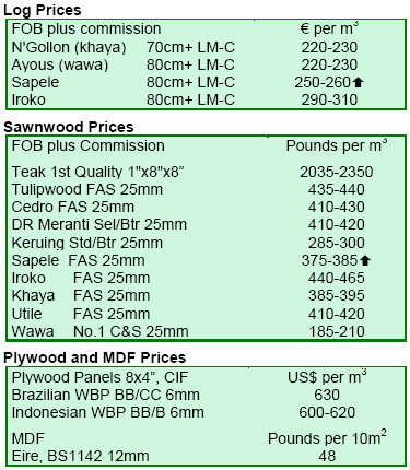 The supply situation for Brazilian sapupira remained very tight. The situation was unlikely to improve soon as the