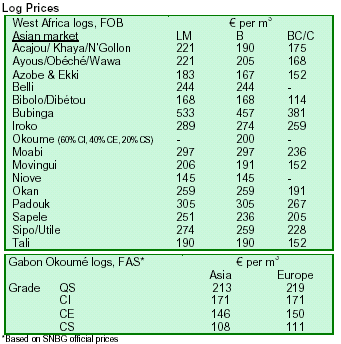 According to some reports, China is becoming slightly overstocked with okan logs. As a consequence, buyers and