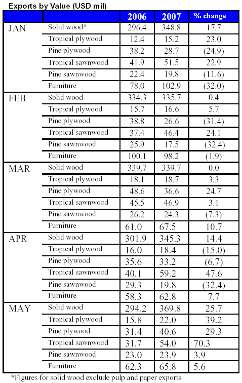 Brazilian exports of most wood products, plywood and sawnwood increased during May. Notably, exports of