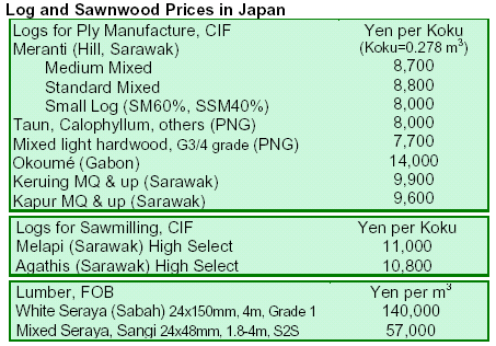 The Supply of South Sea logs and Japanese demand for logs continued to be weak. Japanese plywood mills and